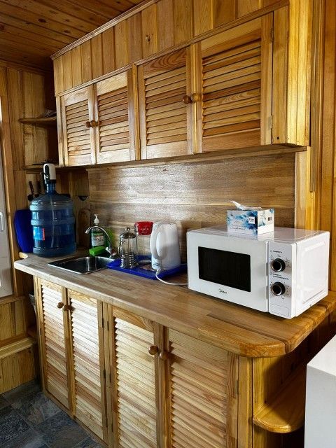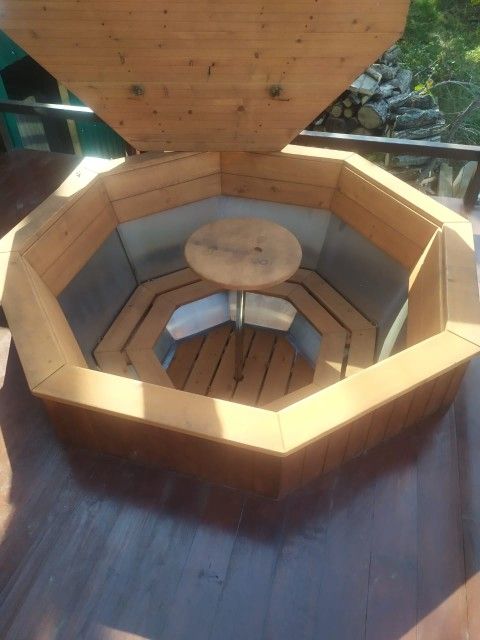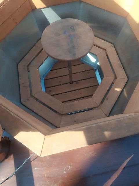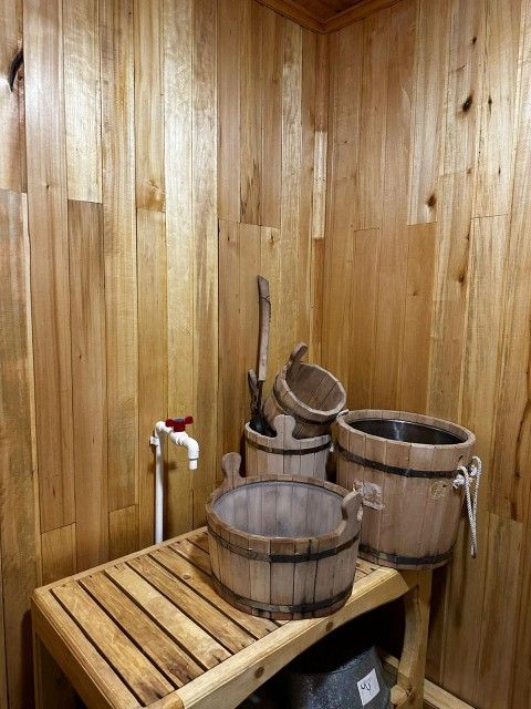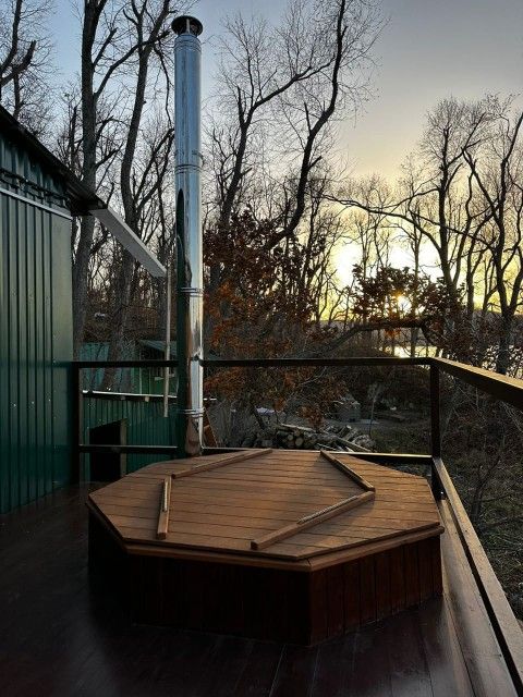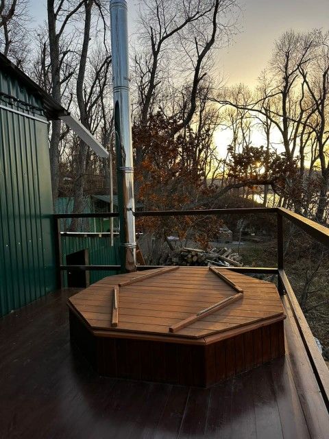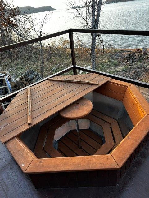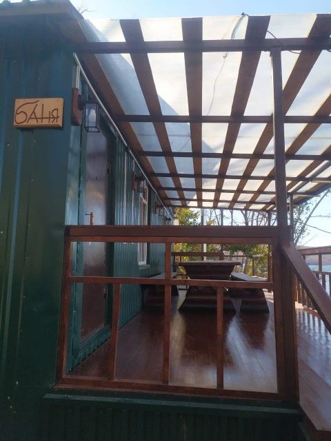 Баня , чан. Аромамасла, веники (береза и дуб). Чан с теплой морской водой на открытой террасе, с видом на бирюзовое море.